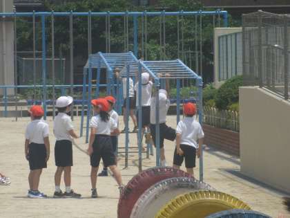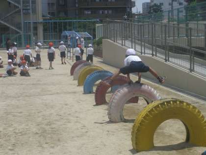 運動場のタイヤとうんていを使っての体育の学習です。うんていでは遊びなれない子どもが昔より多いようです。そういえば、以前は馬とび遊びやすもうやごむとびなど子どもたちが運動場で遊ぶ姿がよく見られたものですが、とんと見なくなりました。子どもの体力や運動能力に影響しているように思います。