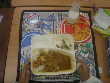 こんだては「チキンカレーライス」「キャベツと三度豆のサラダ」「ヨーグルト」。子どもに一番人気のカレーライスです。