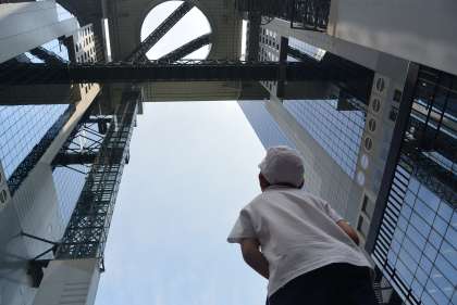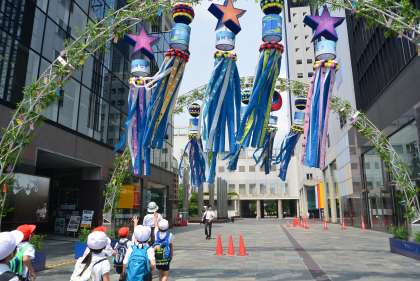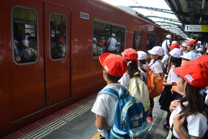 社会科の学習で市内のようすを見学しました。環状線に乗って大阪駅に。電車の中では静かにほかの乗客の人たちに迷惑をかけないようにマナーを守っていました。スカイビルの大きさにおどろいている子どもたちでした。