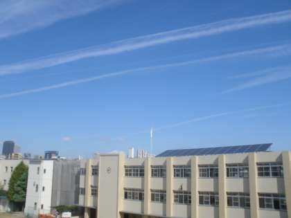 猛暑、大雨でこの夏はたいへんでした。短縮授業も終わって、今日9日から運動会の練習も本格的に始まりました。空は秋らしい青空。校舎の上には飛行機雲とさわやかな朝になりました。。・・・とはいえ昼には日ざしが強くなってきましたけれど。