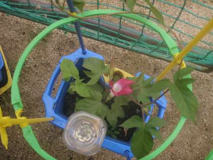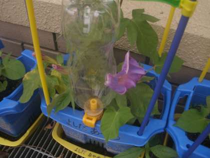 1年生が栽培しているあさがお。ふたりの子のあさがおが一輪ずつ咲きました。