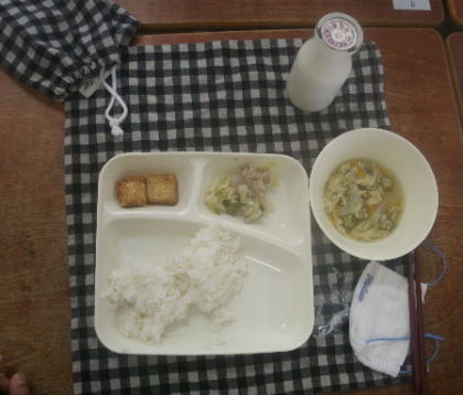 こんだては「豚肉と野菜のいためもの」「かきたま汁」「あつあげのみそだれかけ」。