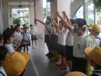 あいさつレンジャーの5人は、きょうはあちら、あすはこちらと校内をかけまわって、あいさつの大切さを伝えています。