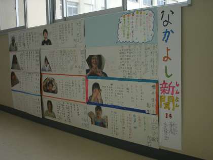 職員室前の廊下にかべ新聞がはりだされました。今年度新しく東中浜小学校にいらっしゃった教職員のみなさんへのアンケート記事です。
