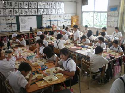 4年生の給食風景です。1組2組とも児童数38名という4年生。体も大きくなって教室が狭く感じます。にぎやかな給食風景です。