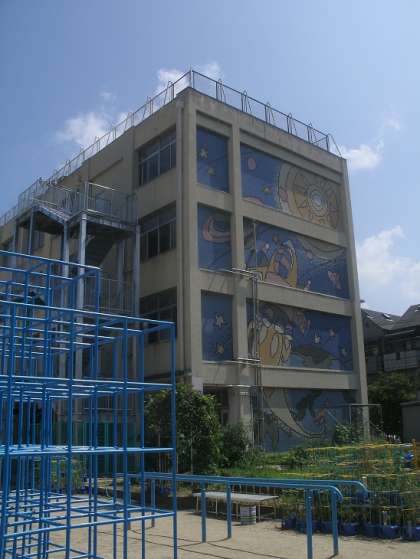 東校舎の南側の壁に宇宙船のタイル画があります。地域の方のデザインで、子どもの夢を描いたものです。学習園がそばにありますが、そこから見上げると雄大です。