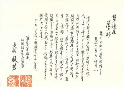 校長室にある屋久杉の板。寄贈していただいたもので、たいへん大きな板です。証明書が下の写真です。