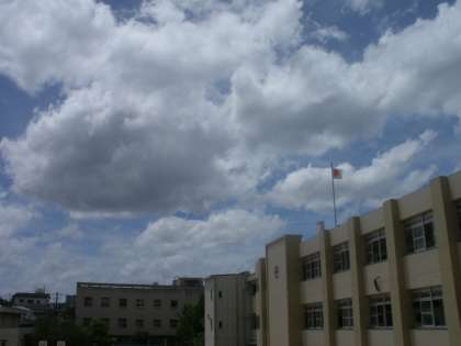 夏の空。雲が校舎の上に。むしあつい一日でした。