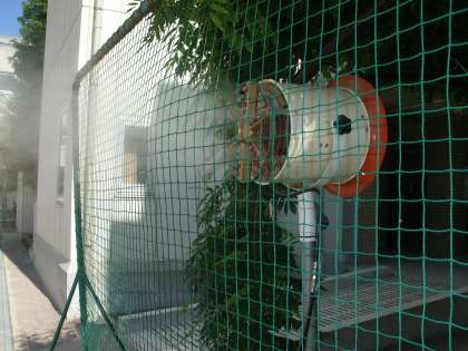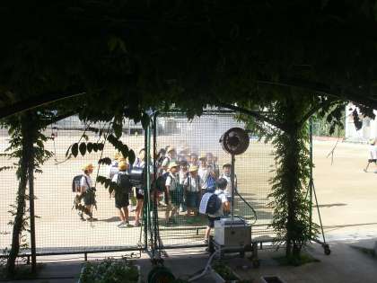 玄関を通った先の藤棚のところに「ドライミスト」の器械を設置しました。さっそく涼しさを味わっている子どもたちですが、ずっとミストをあびているとぬれてきます。「先にランドセルを教室に置いてきなさい!」という先生の声がとびます。