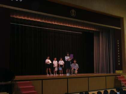 台風で心配されていた終業式が行われました。校歌を歌った後、児童の1学期の感想の発表があり、大きな拍手をもらいました。そのあと、校長先生のお話、夏休みのくらし、プール開放の説明と続きました。みなさん、よい夏休みにしましょうね。