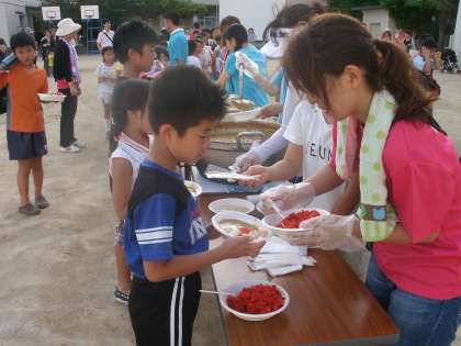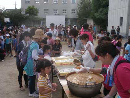 カレーは、あまくちと中辛の二つ。たくさんおかわりができます。よく煮込んだおいしいカレーです。ごはんは、まきで炊いたので、おこげもおいしくいただけました。火の番をしたPTAや地域のみなさん、あせびっしょりでしたね。子どもたちのえがおにあせもふっとんだそうです。
