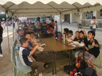 「おいしい!」「おいしい!」・・・テントの下、階段に並んで食べているみなさん、あちこちからうれしい声が聞こえます。おかわりいっぱいしましょう。