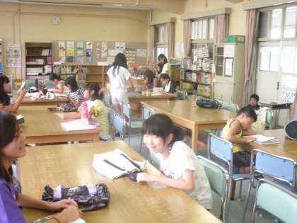 今週は図書室を開放しています。先生、おはなしポケットさん、児童会の図書委員会で子どもたちへ開放しています。貸し出しの手続きは、図書委員会の子どもたちがパソコンでしています。涼しく楽しく、本を読む子どもたちです。