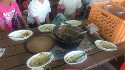 カレー作り カレーを食べて、ごちそうさまをした写真です。みんな満足感いっぱいです。