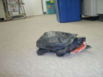 かにかまをくわえて足早に歩く亀吉です。写真を撮るのに追っかけるのが大変です。