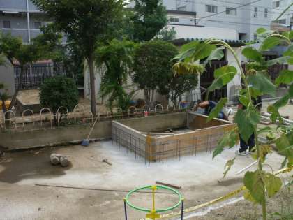 上:学習園の工事・・・囲いが米作りの学習場所です。