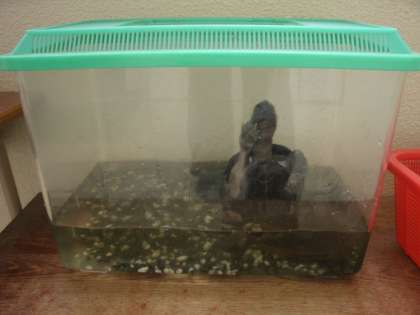 下:亀吉・・・元気です。水槽から出して散歩させろと言っているようです。