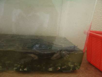 夏休みもあと10日ほどになりましたが、児童のみなさんはいかがお過ごしですか。ご存知の方も多いと思いますが、本校には亀吉以外にも小さい亀がいます。本日の午後2時ごろの写真ですが、上の写真の亀吉は水浴びをして暑さをしのいでいました。一方下の写真の小さい亀はひなたぼっこをして気持ちよさそうにしていました。2匹とものどかに過ごしていました。