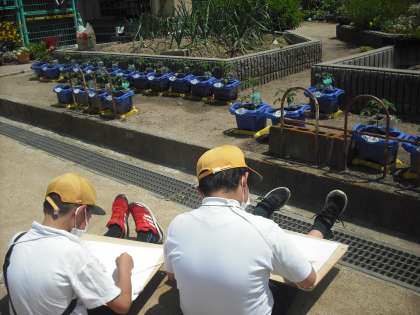 図画工作の課題で、季節を表すものと、学校の校舎を入れて、コンテで写生します。慣れないコンテで手などが汚れることもありますが、みんな真剣に取り組んでいます。単色の表現ですので今までとは違った難しさが有るようですが、少しずつ手を加えて段々と緻密な仕上がりになってきています。