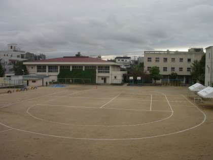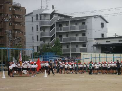 初めての全体練習を1時間目にしました。上:雨が降りそうな空模様だったので、入場行進からスタートしました。中:6時間目は運動会に備えた委員会活動で、児童会代表委員の子どもは開会式の練習です。応援団の子どもは応援練習で一生懸命です。下:子どもたちみんなが下校した後の運動場では、翌日の練習に備えて白線を引いています。