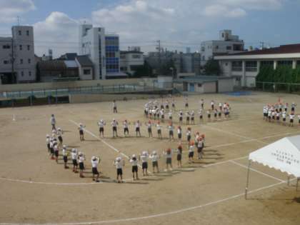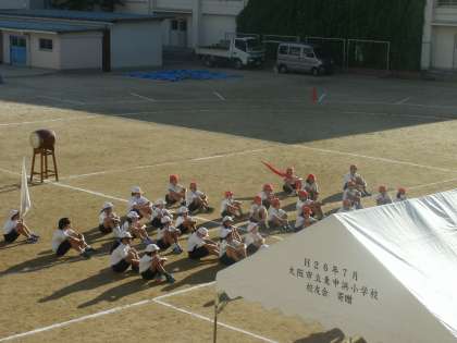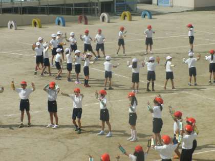 運動会の練習に熱が入っています。上・中は3年生の練習です。腕に飾りをつけて、本番に備えていました。下は応援団です。来週の木曜日の全体練習では応援練習があるので、練習のあと、しっかり先生の話を聞いていました。