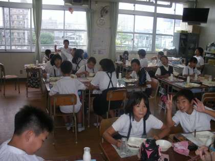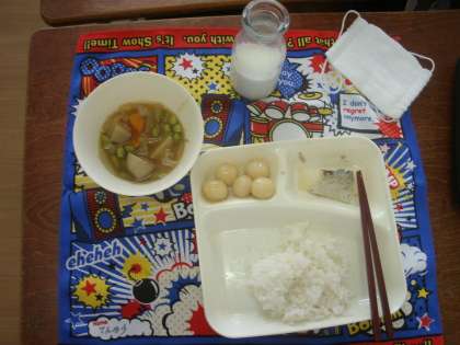 5年2組をたずねました。今日は月見行事献立で、子どもたちはみたらし団子に大喜び。