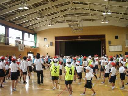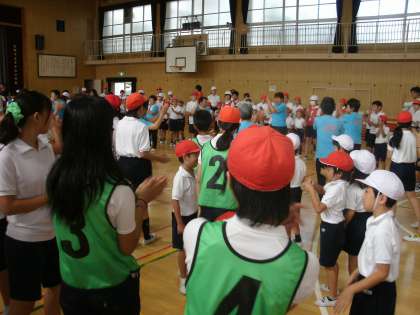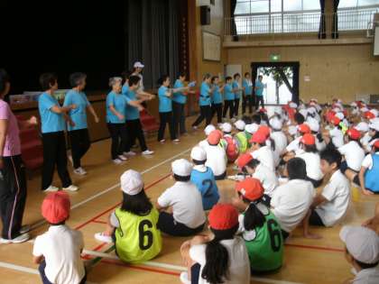 今年度3回目の土曜授業です。地域のみなさん(生涯学習「民踊教室」)が河内音頭を教えてくださいました。毎年の取り組みです。運動会の全校演技で、にこにこ班で集まって踊ります。1時間目には1年生と6年生が体育館で教えていただきました。6年生は今年で6回目で、さすがよく覚えていますが、1年生は「むずかしいわ。」と言っている子もいました。1年生は運動会の演技でもっと長いのをしっかり踊っていますけれど。
