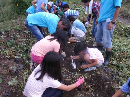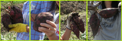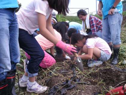 【東中浜連合子ども会の田植え・稲刈り体験】昼食後は子どもはさつまいもをほり、大人は黒枝豆をとりました。大きいおいもにびっくり、大喜びでした。「やきいもやてんぷらにするとおいしいぞ。」「スイートポテトにするねん。」などとうれしそうに言っていました。