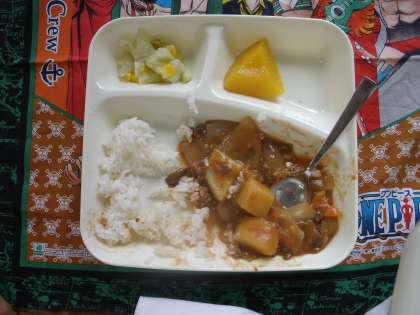 今日のこんだては「ハヤシライス・野菜サラダ・黄桃(かんづめ)」です。ハヤシライスも子どもたちの大好きなこんだてです。