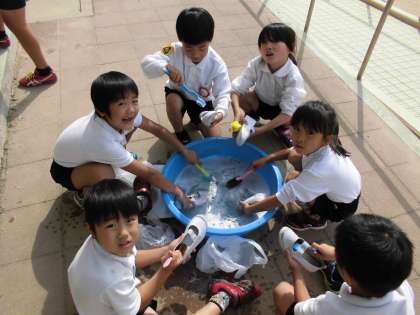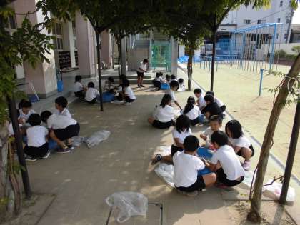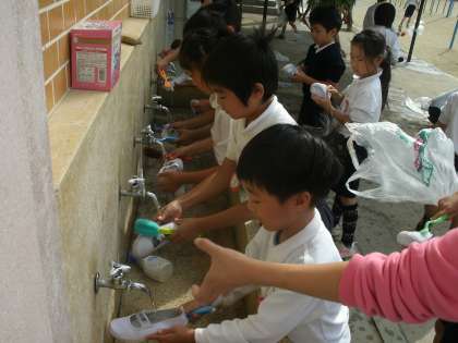 1年生が自分で上ぐつを洗いました。ブラシでこすると汚れがとれていって「白くなった!」「見て見て、黒かってんけどきれいになった!」とうれしそうに話してくれました。