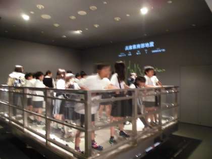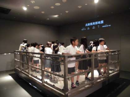 地震の揺れを体験しました。防災センターには、阪神淡路大震災のときの町のようすが再現してあります。