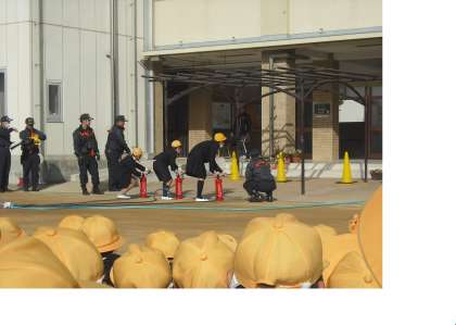避難訓練に続いて水消火器で消火訓練をしました。全学年から代表を決めて、炎に見立てた黄色いコーンを目がけて水を飛ばします。消防署の方の指導を受けながら3人ずつ並んで水を放出していました。