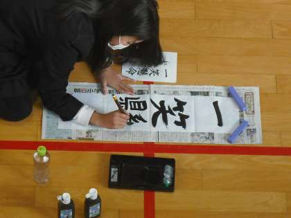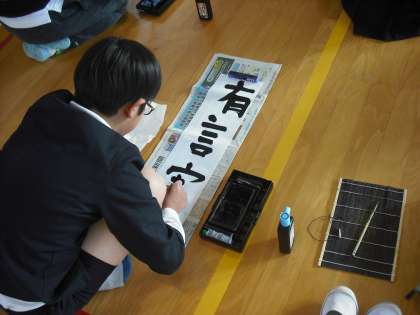 1月11日(木)5年生全員が講堂に集合して、書初めを行いました。細長い和紙に思い思いの4文字を書きます。「一生懸命」「有言実行」などの4字熟語や「生きる力」などの平仮名交じりの言葉、「一笑懸命」などの造語等々、一人ひとりが真剣な顔で筆を持ちます。渡される紙は1枚だけ、練習無しの一発勝負です。どの子も集中して自分の作品に取り組んでいました。
