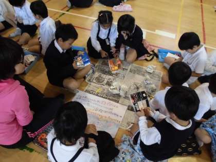 牛乳パックやストロー、画用紙や厚紙を使います。ハサミや色えんぴつを仲よく使います。