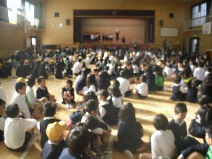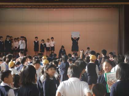 今日の児童集会は、児童会図書委員会の発表でした。今週は読書週間でその取り組みの一環でもあります。図書に関するクイズが出されていました。