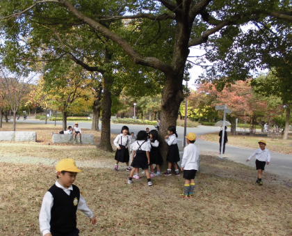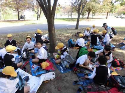 木かげで昼食をとりました。たくさん歩いて「おなかがすいたー。」といっていた子どもたちは大喜びで素敵なお弁当を食べていました。