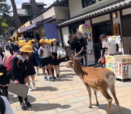 近鉄奈良駅に着いて、東大寺まで歩いていると、たくさんの鹿がお出迎えをしてくれました。児童が「こんにちは」と鹿にお辞儀をすると、鹿もお辞儀を返してくれたのでとても喜んでいました。