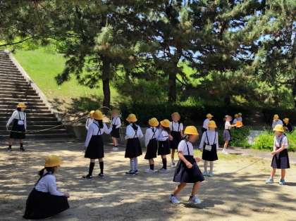 お昼ご飯を食べた後は、天保山に登りました。あまりの低さに子どもたちは「これほんとうに山なの?」と驚きながらも、全力で楽しみました。大縄跳びをしたり、自然に触れあったりなど、のびのびと遊んでいました。