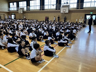 東中浜小学校では朝に児童朝会を行い、校長先生からいじめ対策について上記の内容を嚙み砕きながらお話がありました。