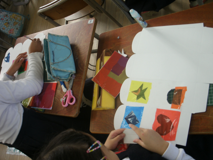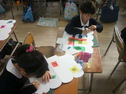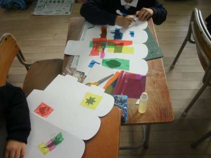 カラーセロファンを使って厚紙にカラフルな窓を作っています。「光のプレゼント」というなまえがついています。