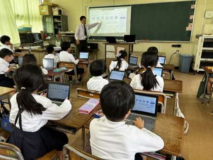 2週間に1日、ICT支援員が本校で勤務しています。この日は2年生でタブレット端末での文字入力についての授業で支援を行いました。