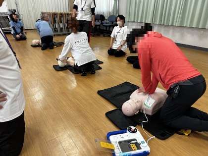 子どもたちが楽しく、安全に過ごすために、心肺蘇生法の確認やプール周辺の施設や機械の確認をしました。