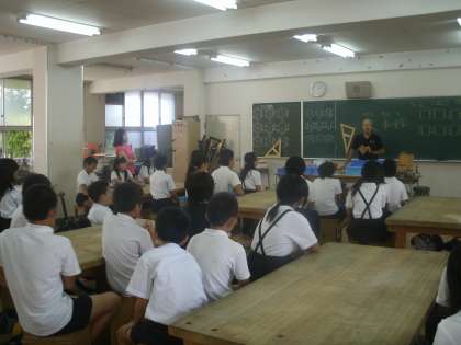 5・6時間目に東中浜小学校・諏訪小学校6年生が城東中学校で体験授業を受けました。中学校の先生に中学校の教室で授業を受けるという取り組みです。1組—社会科、2組—技術科、3組—音楽科。楽しい体験でした。