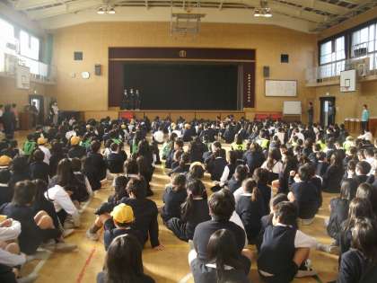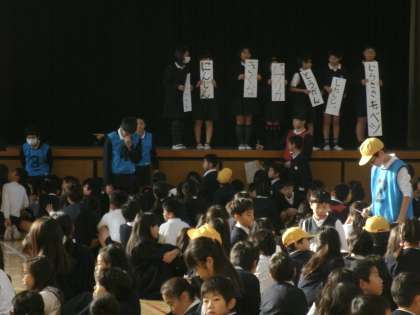 今回は栽培委員会の発表でした。栽培委員会は「やさいビンゴ」をしました。やさいをみんなに知ってもらおうという一工夫したビンゴゲームでした。「むらさいキャベツ」「じねんじょ」「とうがん」などを出したのも、こんなやさいがあるよという、一工夫です。