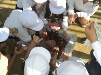 2年生が学習園で芋ほりをしました。大きなさつまいもがいっぱいとれました。子どもたちはおいもをのぞき込んで大喜び。後日、みんなで蒸したおいもを少しずつですが味わうそうです。