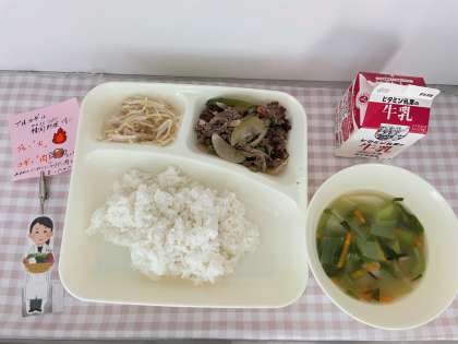給食では牛肉と玉ねぎ、ピーマンに下味をつけ、オーブンで焼いています。
