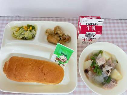 『鶏肉のカレー風味焼き』は、鶏肉にカレー粉で下味をつけ焼いています。子どもたちの大好きなカレー味で、とても好評です♪
