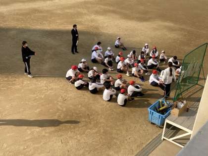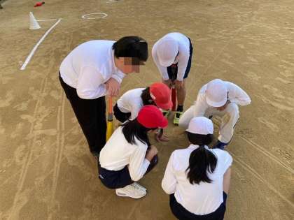11/22(金)6年生はこの日も朝からティーボールに取り組んでいました。作戦タイムでは、タブレット端末を使いながら得点の重ね方、点を取られない守り方について意見交流する様子もありました。