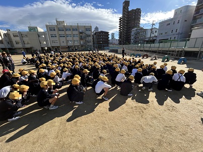 避難訓練をおこないました。約600人の子どもたちが4分かからずに写真のように避難します。とてもすごいことです。