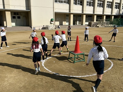 的をねらって投げますが、コートの中の子どもたちが的を守っています。友だちと協力して、ボールを投げて的をたおします。